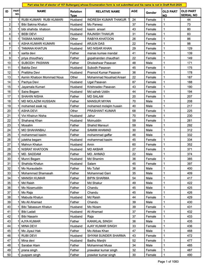 वर्तमान में जो सूची राजनीतिक दलों को सौंपी जा रही है, उसका शीर्षक मात्र इतना भर है: “Part wise list of elector of concerned constituency whose Enumeration Form is not submitted and whose name is not in Draft Roll 2025”. इसमें सिर्फ यह बताया गया है कि किन लोगों का नाम ड्राफ्ट सूची में नहीं है, परंतु क्यों नहीं है, इसका कोई विवरण नहीं दिया गया है। इससे यह भी अनुमान लगाना मुश्किल हो गया है कि किसी व्यक्ति का नाम किसी त्रुटि, जानबूझकर हटाने या प्राकृतिक कारण से गायब हुआ है। औसतन हर विधानसभा क्षेत्र से 25,000 से 30,000 नाम हटाए गए हैं, लेकिन इनमें से किसका निधन हुआ, कौन स्थानांतरित हुआ, या कौन रिपीटेड रिकॉर्ड था—इसकी जानकारी पूरी तरह अनुपस्थित है।