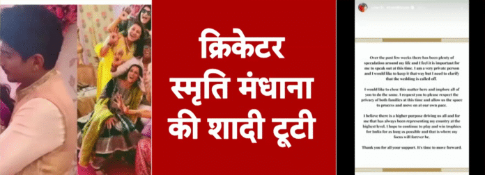भारतीय क्रिकेट की सबसे लोकप्रिय और सम्मानित चेहरों में से एक, स्मृति मंधाना ने आखिरकार वो बात दुनिया के सामने रख दी, जिसके बारे में पिछले कुछ हफ्तों से सिर्फ फुसफुसाहटें चल रही थीं। इंस्टाग्राम पर एक भावुक नोट लिखते हुए उन्होंने साफ कर दिया कि उनकी और पलाश मुच्छल की शादी अब रद्द हो चुकी है। जब से ये अफवाहें शुरू हुईं थीं, फैंस लगातार सवाल कर रहे थे, लेकिन मंधाना, जो कभी अपनी निजी जिंदगी पर खुलकर बात नहीं करतीं, इस बार चुप रहना मुश्किल समझ रही थीं।