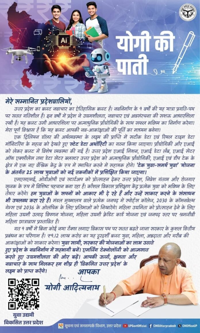मेरे प्यारे प्रदेशवासियों, उत्तर प्रदेश का नया बजट केवल वित्तीय आंकड़ों का दस्तावेज नहीं है, बल्कि यह प्रदेश के विकास का एक स्पष्ट और मजबूत रोडमैप पेश करता है। पिछले नौ वर्षों में उत्तर प्रदेश ने विकास की नई गति पकड़ी है। सड़क, एक्सप्रेसवे, मेडिकल कॉलेज, शिक्षा और रोजगार जैसे क्षेत्रों में हुए बदलाव ने प्रदेश की तस्वीर को पूरी तरह बदल दिया है। ग्रामीण और शहरी इलाकों में आधारभूत संरचनाओं को मजबूत किया गया है, जिससे हर नागरिक को विकास का लाभ मिल सके।