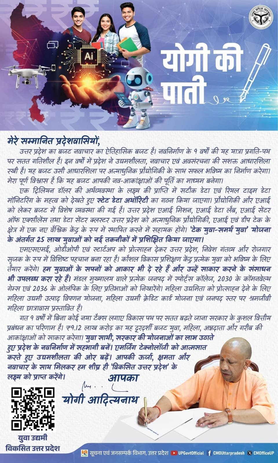 प्रदेश ने स्टार्टअप और निवेश के अवसर बढ़ाए हैं। नए उद्योग और डिजिटल सेवाओं के माध्यम से युवाओं को रोजगार और उद्यमिता के मौके दिए जा रहे हैं। इस बजट का उद्देश्य यही है कि प्रदेश का हर युवा, किसान और महिला आत्मनिर्भर बने। डिजिटलाइजेशन, स्मार्ट तकनीक और आधुनिक इंडस्ट्री को जोड़कर हर जिले में विकास की स्पष्ट तस्वीर दिखाई दे।
