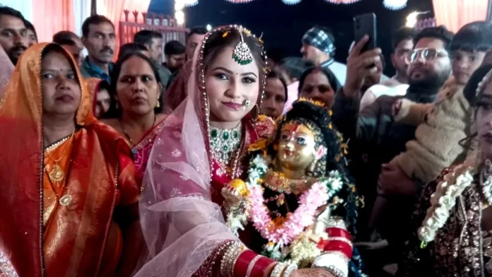 बदायूं के एक छोटे से गांव में शनिवार का दिन हमेशा के लिए इतिहास बन गया, जब 28 वर्षीय पिंकी ने अपने जीवन का सबसे बड़ा निर्णय सबके सामने निभाया उन्होंने किसी इंसान नहीं, बल्कि अपने आराध्य भगवान श्रीकृष्ण को अपना पति स्वीकार किया। गांव के चौपाल में सजी मंडप, हल्दी की खुशबू, शहनाई की धुन और चारों ओर उमड़े हुए ग्रामीणों की भीड़ सब कुछ वैसा ही था जैसा किसी सामान्य विवाह में होता है, बस फर्क इतना था कि दूल्हा स्वयं गिरिधर नागर थे, जिनके विग्रह को पिंकी ने अपनी गोद में लेकर सात पवित्र फेरे लिए।